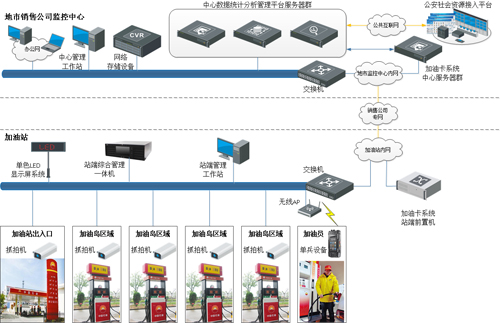 加油站車牌識別及客戶服務(wù)系統(tǒng)由站端系統(tǒng)(部署在加油站)、傳輸網(wǎng)絡(luò)和中心系統(tǒng)(部署在地市銷售公司監(jiān)控中心)這三個相互銜接、缺一不可的部分組成。