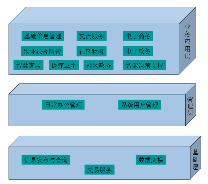 在物聯(lián)網(wǎng)應用環(huán)境下,可將智慧社區(qū)服務系統(tǒng)的功能需求可概括為以下三個層次基礎層、管理層、業(yè)務應用層。